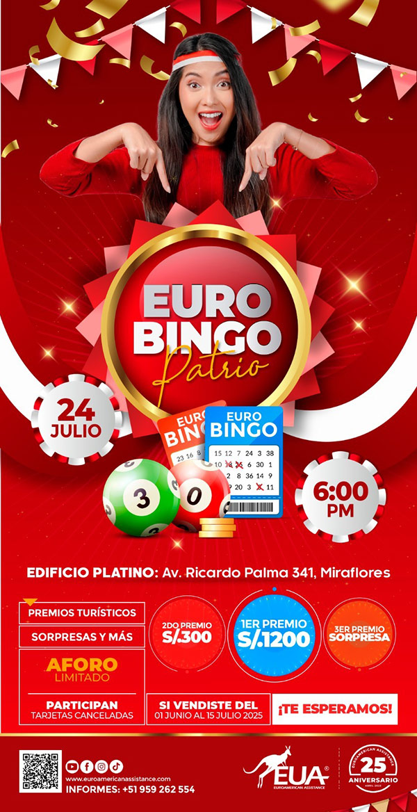 En el marco de las celebraciones por Fiestas Patrias, Euroamerican Assistance organiza su esperado Eurobingo 2025, una velada llena de premios que se realizará el 24 de julio a las 6:00 p. m., en Av. Ricardo Palma 341, Miraflores. Como ya es tradición, este evento busca premiar la confianza y esfuerzo de todos los agentes de viajes. Los agentes que deseen participar solo deben emitir con EUA entre el 1 de junio y el 15 de julio de 2025 en productos Classis, Priority, International, Invicta, Gold y Platino, considerando que cada venta equivale a una tarjeta y será canjeada por un cartón para el bingo. Para mayor información sobre el evento, se invita a los agentes a ponerse en contacto con sus ejecutivos de cuenta o al soporte comercial EUA +51 959 262 554