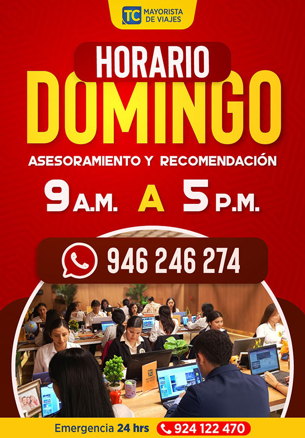 TC Mayorista ha ampliado su horario de atención para ventas y cotizaciones los fines de semana. Los agentes podrán realizar sus reservas también los domingos, de 9 a.m. a 5 p.m., en respuesta al incremento de solicitudes. Esta ampliación se suma a su atención regular de lunes a viernes, de 9 a.m. a 11 p.m., y los sábados, de 9 a.m. a 10 p.m. Además, su área de soporte HELPDESK 24/7 continuará disponible para casos de emergencia. Con esta iniciativa, TC MAYORISTA reafirma su compromiso de brindar un servicio integral, priorizando la atención de calidad y una respuesta ágil ante las necesidades de sus agentes durante toda la semana.