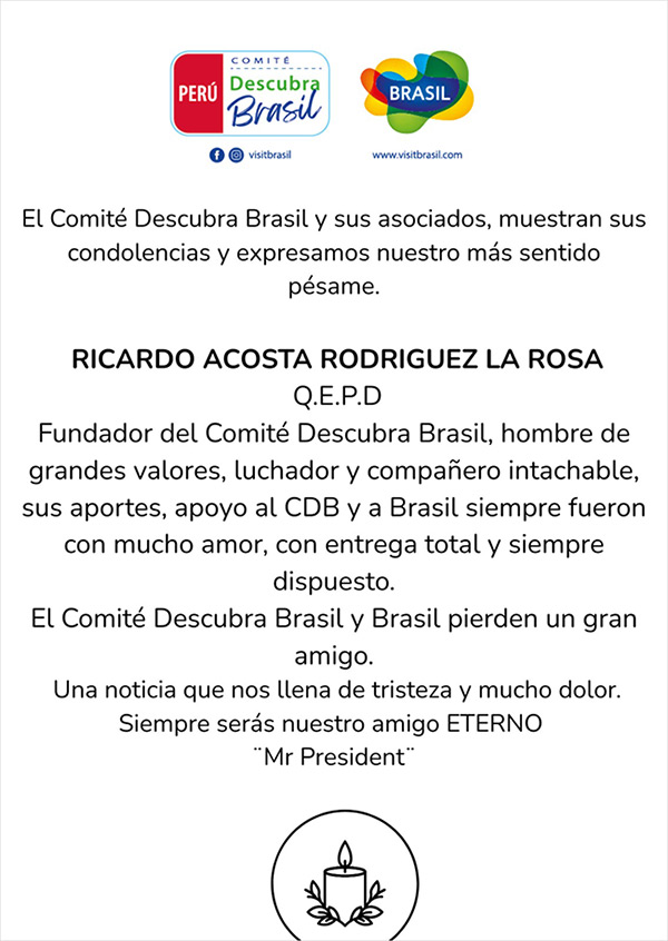 El Comité Descubra Brasil de Perú, organización encargada de promover los viajes a los destinos brasileños, expresó sus condolencias a los familiares y amigos de Ricardo Acosta Rodríguez La Rosa por su lamentable partida. La organización destacó el trabajo de Ricardo Acosta, quien fue fundador y presidente del Comité Descubra Brasil. Compartimos su comunicado: