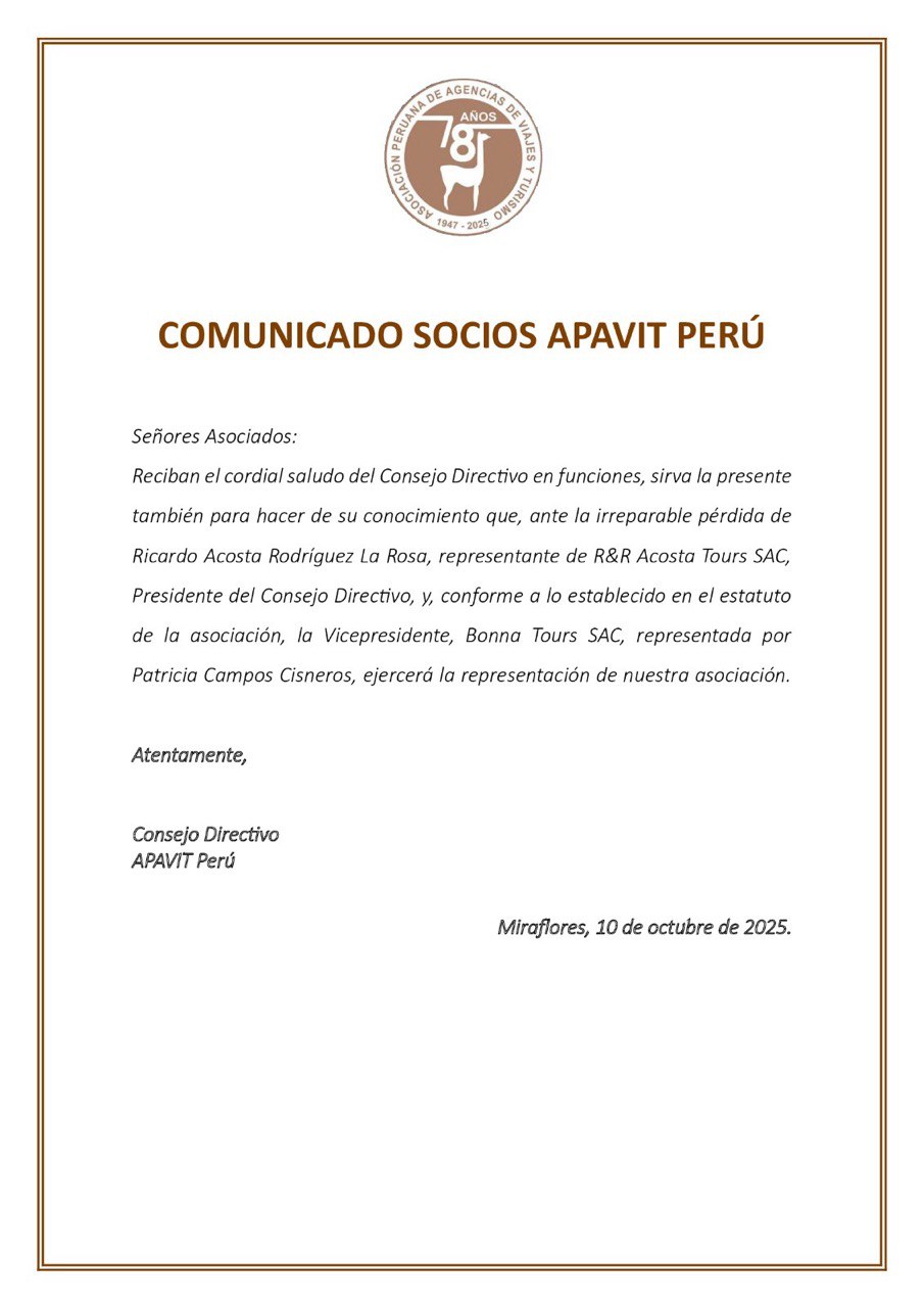 La Asociación Peruana de Agencias de Viajes y Turismo (APAVIT) comunicó oficialmente a sus asociados que, conforme a lo estipulado en su estatuto institucional, la señora Patricia Campos Cisneros, representante de Bonna Tours SAC, asumirá la presidencia del gremio. Esta medida se adopta tras el fallecimiento del señor Ricardo Acosta Rodríguez La Rosa, quien ejercía como presidente del Consejo Directivo y era representante de R&R Acosta Tours SAC. El comunicado, emitido por el Consejo Directivo con fecha 10 de octubre de 2025, señala que la sucesión responde al marco normativo vigente de la asociación, el cual contempla la continuidad en la representación mediante la designación del miembro correspondiente. Se entiende entonces que la señora Campos Cisneros, como parte del Consejo Directivo, asumirá las funciones inherentes a la presidencia de APAVIT. Si bien la noticia no reviste mucha novedad, responde a algunas consultas de los últimos días, en vista que APAVIT es uno de los gremios de agencias de viajes más importantes del país.