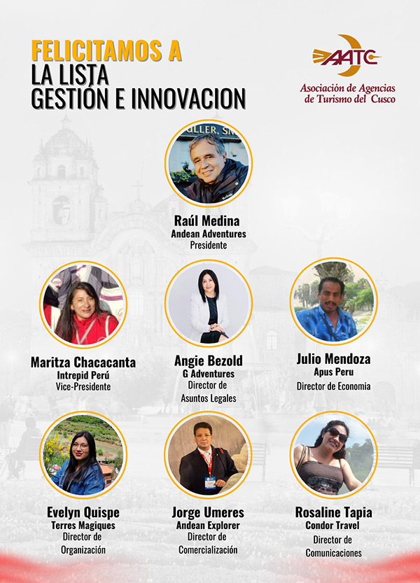 La Asociación de Agencias de Turismo del Cusco (AATC) realizó ayer las elecciones de su nueva junta directiva, siendo elegida con 31 votos la lista “Gestión e Innovación”, para conducir el gremio en el periodo 2026-2027. La nueva directiva tendrá a Raúl Medina (Andean Adventures) como Presidente, Maritza Chacacanta (Intrepid Perú) como Vicepresidente, Angie Bezold (G Adventures) como Directora de Asuntos Legales, Julio Mendoza (Apus Perú) como Director de Economía, Evelyn Quispe (Terres Magiques) como Directora de Organización, Jorge Umeres (Andean Explorer) como Director de Comercialización y Rosaline Tapia (Condor Travel) como Directora de Comunicaciones. La transferencia del cargo inicia el 2 de febrero y la juramentación será el 20 de febrero, informó el gremio a T News.